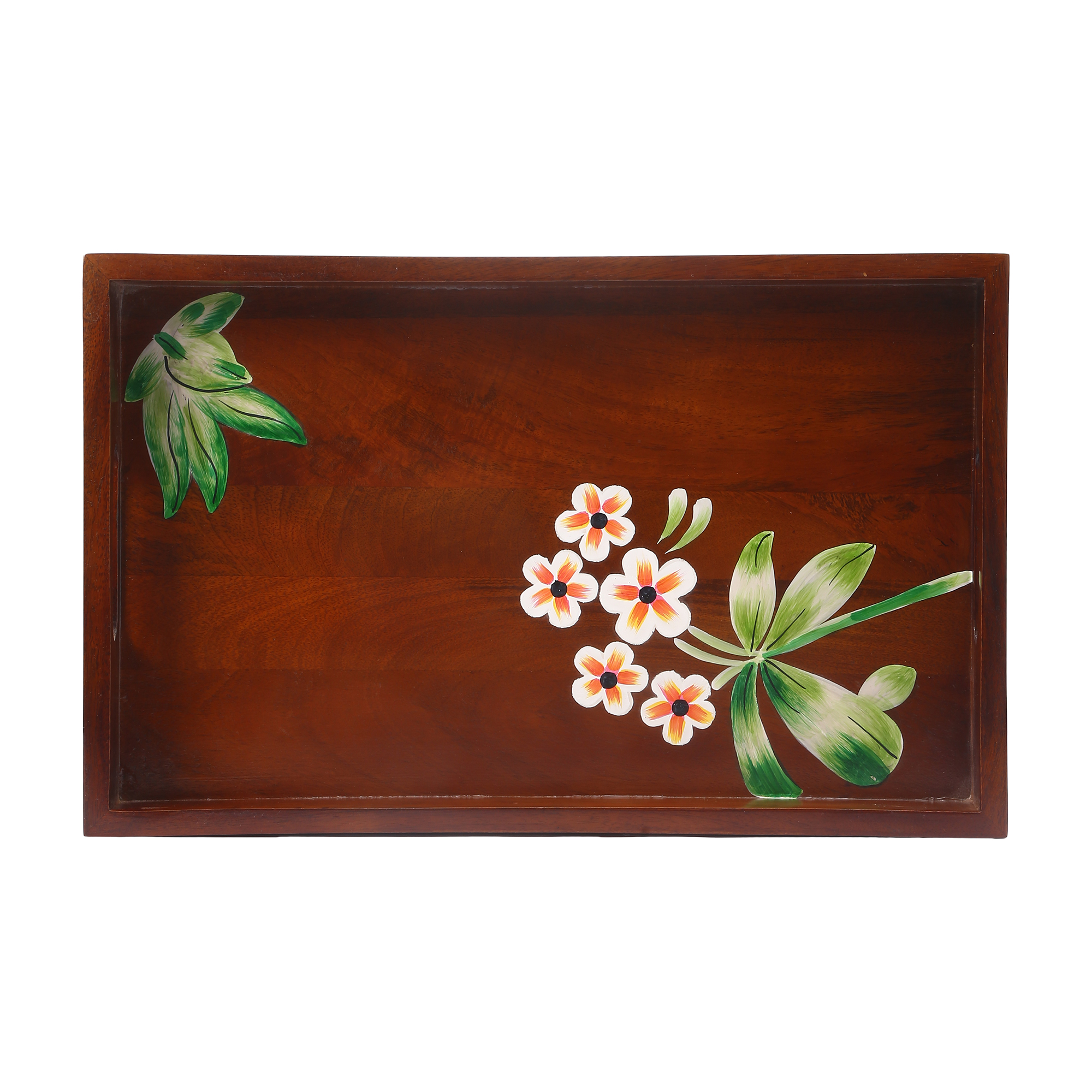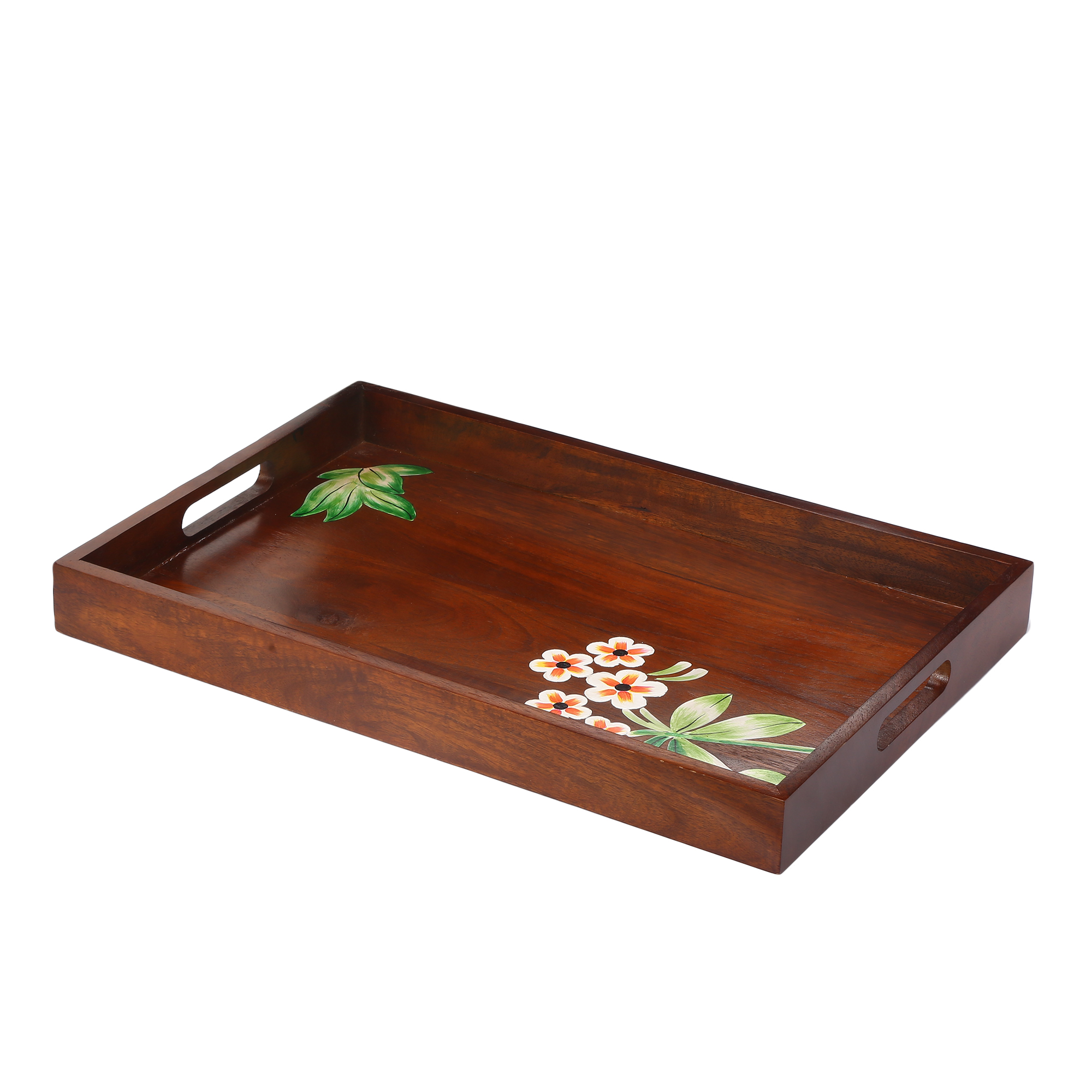 The Hand-Painted Iris Walnut Rectangular Tray showcases elegant craftsmanship with a beautifully detailed iris design on a rich walnut finish. Carefully handcrafted from premium mango wood, this tray blends artistic charm with everyday practicality. Perfect for serving drinks, snacks, or styling your coffee table, it adds a warm and sophisticated touch to any space.